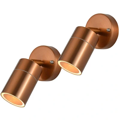 General description This 2 pack of Litecraft outdoor spotlights is an excellent choice for enhancing the safety and security of your outdoor spaces. The adjustable spot heads allow you to direct light precisely where needed, while the modern and sleek design adds a stylish touch to your exteriors. Technical specifications Product Type: Outdoor Spotlight Bulbs Required: 2 (Not Included) Bulb Type: GU10 Max Bulb Wattage: 8 Watt Max Bulb Voltage: 240 Volt Light Source: LED Height: 14.4 cm approx. Width: 9 cm approx. Length: 8.9 cm approx. Material: Metal, Glass Colour: Copper Weight: 0.52 kg IP Rating: IP44 Rated for safe use outdoors Dimmable: No Other information Guarantee: 2 Year Images are for illustration purposes only.
