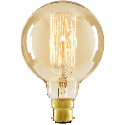 General description Infuse warmth and style into your room with this gold-tinted B22 bayonet cap squirrel cage filament globe lamp. The unique filament design creates a striking visual effect, ideal for retro or industrial-style lighting fixtures. Its 40W output offers both decorative charm and functional lighting. Technical specifications Product Type: Light Bulb Cap Type: B22 Bayonet Cap Shape: Globe Wattage: 40 Watt Voltage: 240 Volt Light Source: Incandescent Dimmable: No EU Energy Efficiency Rating: F Length: 14 cm approx. Diameter: 9.5 cm approx. Material: Metal, Glass Colour: Gold Tinted