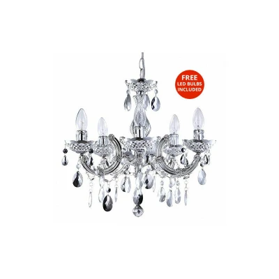 General description Illuminate your space with the Marie Therese Chandelier, featuring 5 arms and a striking silver finish. This chandelier comes with free LED bulbs, providing both energy efficiency and bright illumination. Its elegant design makes it a perfect addition to dining rooms, living rooms, or hallways. Technical specifications Product Type: Chandelier Bulbs Required: 5 (Included) Bulb Type: E14 Small Edison Screw Max Bulb Wattage: 6 Watt Max Bulb Voltage: 240 Volt Light Source: LED Height: 145 cm approx. Diameter: 45 cm approx. Ceiling Cap Diameter: 10.5 cm approx. Drop: Max: 145 cm, Min: 47 cm approx. Material: Metal, Acrylic Weight: 2.56 kg Installation Complete with fitting instructions and fixings. Easy to adjust drop for personal preference. Suitable for dimming with dimmer switch (not included).