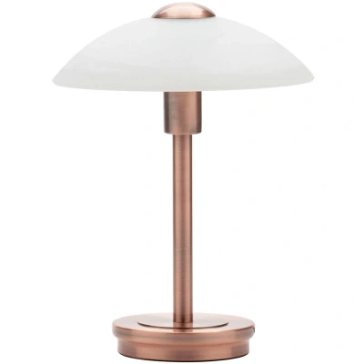 General description This vintage design table lamp combines modern touch-sensitive functionality with a traditional aesthetic. The lamp features an antique copper base and an alabaster glass shade, making it a perfect addition to bedrooms, living rooms, and home offices. Technical specifications Product Type: Table Lamp Bulbs Required: 1 (Not Included) Bulb Type: G9 Max Bulb Wattage: 3 Watt Max Bulb Voltage: 240 Volt Light Source: LED Height: 27 cm approx. Base Diameter: 11 cm approx. Shade Height: 7 cm approx. Shade Diameter: 20 cm approx. Material: Metal, Glass Colour: Antique Copper, Frosted Weight: 1.3 kg Touch sensitive On/Off base Maximum bulb size: Length: 5 cm, Width: 1.7 cm, Depth: 1.5 cm