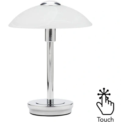 General description Create a contemporary aesthetic in your home with the Alabaster Shade Touch Table Lamp in Chrome. The sleek chrome finish offers a modern look that pairs effortlessly with your existing interiors. This table lamp features touch-sensitive technology for your convenience, making it ideal as a bedside light. Technical specifications Product Type: Table Lamp Bulbs Required: 1 (Not Included) Bulb Type: G9 Max Bulb Wattage: 3 Watt Max Bulb Voltage: 240 Volt Light Source: LED Height: 27 cm approx. Base Diameter: 11 cm approx. Shade Height: 7 cm approx. Shade Diameter: 20 cm approx. Material: Metal, Glass Colour: Polished Chrome, Frosted Weight: 1.3 kg Touch sensitive On/Off base Maximum bulb size: Length: 5 cm, Width: 1.7 cm, Depth: 1.5 cm