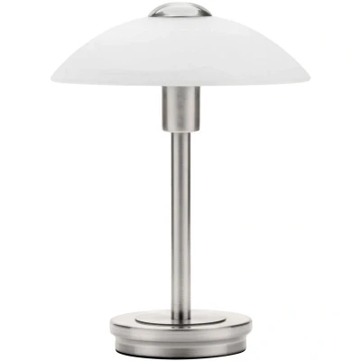 General description Add a convenient reading light to your home with the Alabaster Shade Touch Lamp in Satin Nickel, featuring a touch sensitive base. This table lamp has a classic style design with alabaster glass and a satin nickel base, making it a perfect addition to any home office, living room, or bedroom. Technical specifications Product Type: Table Lamp Bulbs Required: 1 (Not Included) Bulb Type: G9 Max Bulb Wattage: 3 Watt Max Bulb Voltage: 240 Volt Light Source: LED Height: 27 cm approx. Base Diameter: 11 cm approx. Shade Height: 7 cm approx. Shade Diameter: 20 cm approx. Material: Metal, Glass Colour: Polished Chrome, Frosted Weight: 1.3 kg Touch sensitive On/Off base Maximum bulb size: Length: 5 cm, Width: 1.7 cm, Depth: 1.5 cm