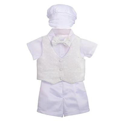 This is a smart 4-piece baby boy christening outfit made of quality fabric. It includes shirt, vest, pants, and matching bonnet. Short sleeve shirt has a neat pointed collar with smart bow tie on the front and 4 pieces of buttons at the front for easy fastening. Three buttons vest with a pair of faux pocket on each sides. A pair of short pants with half elastic waistband for comfortable wearing and perfect fit. A matching adorable bonnet is a perfect highlight of this gorgeous outfit!