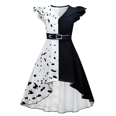 Eye-catching devilish dalmatian costume fancy dress for girls. Dress up like the fashion queen at Halloween party! High low dress with V neck peter pan collar and short ruffle sleeves. Features design of half black and half white with digital printed dalmatian black spots. Pullover style for easy dressing. Made of stretchy and comfortable polyester materials, no itchy! Sizes for little kid girls, 4-5, 5-6, 7-8, 9-10, 10-11 and 12-13. Suitable for dalmatian theme party, Halloween costume, fancy dressing up clothes, princess birthday party outfits, children tea party, photo shooting, play wear outfits etc., Manufacturer: Lito Angels