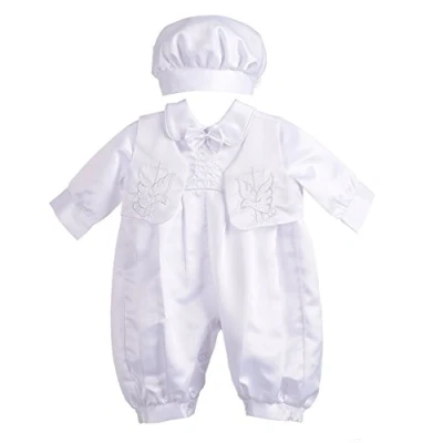 【3 Pieces Set Baby Boy Christening Gown】Creamy white romper + Fully lined waistcoat + Bonnet hat. Neat baptismal clothing set for christening or baptismal activities. 【White Bodysuit with Embroideries】Satin long sleeve jumpsuit romper with an attached smart bow tie at collar. Loose fit trousers with pleated legs design. Embroidered pigeon and cross pattern on satin vest. Matching a beret style hat with elastic band to ensure a perfect fit. 【Easy Dressing with Comfortable Materials】Made of quality satin. Breathable fabric keeps babies for all day comfort. Button closure at back and between the legs for easy dressing and diaper changing. 【Newborn, Infant and Toddler Baby Size】Age range included 0-3 months, 3-6 months, 6-12 months and 12-18 months. Age is only an approximation of size. Please measure the actual body size and refer to the size chart to choose a proper size for best fit. 【Special Occasions】A perfect blessing outfit for christening, baptism, church, communion, dedication, catholic events, Easter events, ceremony, formal wear, birthday, festival, religious activities, Thanksgiving Day or Christmas. It is also a lovely gift for your little baby boys, nephews or grandson.
