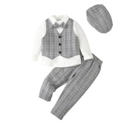 Lito Angels Little Kids Boys Gentleman Plaid Waistcoat Suit Set Formal Wedding Outfits with Hat Age 5 6 Years, Grey