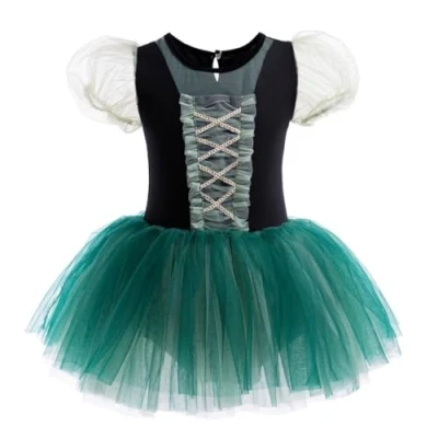 Beautiful medieval ballerina costume fancy dress up dance wear for little kids girls! Your daughter will dance happily with this super cute inspired renaissance style ballet tutu skirt! Cotton bodice with criss cross corset details. Features illusion round neck and short puff sleeve design. Ballet leotard with puffy tutu skirt of 4 sheer green tulle layers. Pullover style with elastic waist and button closure at back. Built-in knickers underneath with popper fastening for easy wear and take off. Made of soft, comfortable fabric and stretchable materials. No itchy! Size of this gorgeous dancing outfit included age 2-3, 3-4, 5-6, 6-7 and 7-8 years. Age is only an approximation of size. Please refer to our size chart for more accurate measurements. Suitable for dance class, ballet dance training or practice, gymnastic exercise, stage performance, dancing contest competition, heritage dancing theme, Coppélia ballerina outfit, carnival holiday dancewear, birthday gift or themed party fancy dress up. Also great for Halloween costume, photo shooting clothes, princess party play dress, or world book day clothing etc.