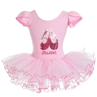 Sweet and adorable pink ballerina dress ballet leotard with tutu skirt for kids girls. Comfortable fancy dance wear outfit for dancing school or stage performance. Cotton bodice with round neckline and scoop back. Features an elegant shiny sequin ballet shoes pattern and a cute rosette on bodice. With a pair of tulip sleeve looks so special! Fabulous 3 layers of tulle netting skirt stick out from waist to create a puffy and fluffy tutu skirt. Pull on style with built-in knickers underneath and snap button. Made of soft and stretchable cotton. With elastic waistband for easy dressing, lightweight fabric keeps your little one in breathable comfort all day! Size for toddler and children, age 2, 2-3, 3-4, 4-5, 5-6 and 6-8 years. Age is only an approximation of size. Please measure the actual body size and refer to the size chart to choose a proper size for best fit. Great ballet dance clothing for dance class, stage performance dancewear, festival dancing events, competition outfit, training exercise, Halloween costumes, birthday or princess theme party dressing up clothes, carnival cosplay playwear, pretend play dress, photo shooting outfits, or world book day dressing up clothes.