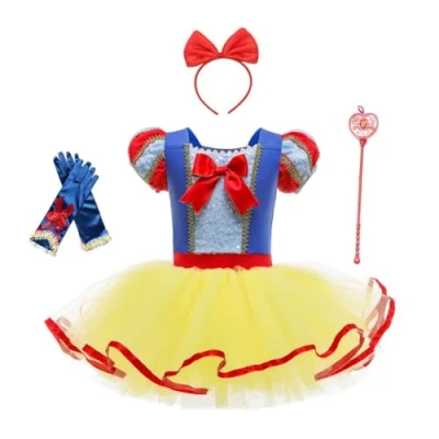 Beautiful ballerina dance dress up for your little girls! Your daughter will love this inspired princess Snow White ballet tutu skirt costume! Featuring a big red bowknot on sequined bodice. Princess puff sleeves with lace and golden thread line design. Fluffy ballet leotard with 4 layers of yellow tulle skirt. Built-in knickers underneath with snap button bottom for easy wear and take off. Made of comfortable fabric and stretchable materials. Cotton bodice with elastic waistband. No itchy! Size of this gorgeous dancing outfit included 18 - 24 Months, 2 - 3, 3 - 4, 5 - 6, 6 - 7 and 7 - 8 years. Suitable for dance school class, ballet dance training wear, gymnastic exercise, stage performance dancewear, dancing contest competition, birthday gift, theme party or Halloween fancy dress up, carnival holiday outfit., Manufacturer: Lito Angels
