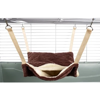 Plush fluffy lined hammock with pouch - part of the little friends range of specialist small animal toys. Hammock with pouch - designed for larger pets such as ferrets rats chinchillas. It clips to the cage via metal clips attached to straps. this item can be either hung vertically (where animals can hide in the pouch) or horizontally where they can snuggle under the covers. Measurements: 30cm (12") x 37cm (14.5") excluding straps. it will fit up to 4 adult rats or 1-2 ferrets. Please check regularly for signs of chewing and replace as necessary.