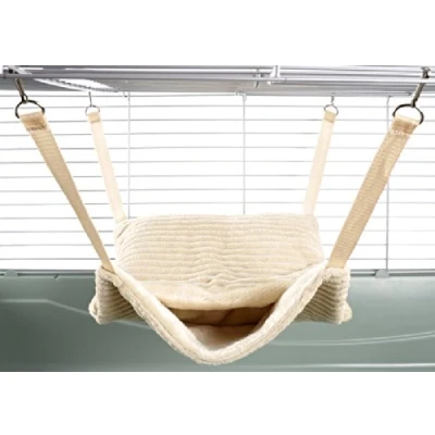 Plush fluffy lined hammock with pouch - part of the little friends range of specialist small animal toys. Hammock with pouch - designed for larger pets such as ferrets rats chinchillas. It clips to the cage via metal clips attached to straps. this item can be either hung vertically (where animals can hide in the pouch) or horizontally where they can snuggle under the covers. Measurements: 30cm (12") x 37cm (14.5") excluding straps. it will fit up to 4 adult rats or 1-2 ferrets. Please check regularly for signs of chewing and replace as necessary.