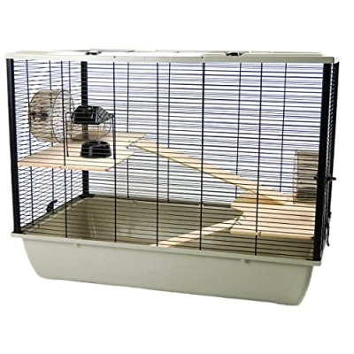 The langham cage is ideal for rats, hamsters, chinchillas and other small sized pets. The cage comes with two shelves and two ladders forming a multi floor system (as shown)! All accessories shown included. 2 x house, 2 x wheel and 2 x bowl. super narrow bar spacing 1cm. This cage is part of our space saving range and is easily collapsible for storage. Measures l: 77cm w: 47cm h: 58cm