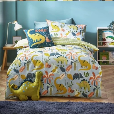 Featuring brightly printed plant-eating dinosaurs munching on palm jungle florals, set against a grey-blue background. Complete with an organic scandi-shaped reverse inspired by dinosaur scales. Finished with a clear button closure. Made of easy-care polycotton, this duvet cover set is soft and hard-wearing. Machine Washable (40 degrees max), Low Tumble Dry and Cool Iron Only.