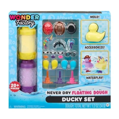 NEVER DRY FLOATING DOUGH DUCKY SET: Provides a fun, imaginative, and tactile experience with endless possibilities TWO UNIQUE COLOURS: Features two unique Wonder Factory Never Dry Floating Dough colours that have no gluten; they stay soft, smell great, and float in water CREATIVE & IMAGINATIVE PLAY: Shape dough with the included mould to make an adorable ducky; features 20+ ducky accessories for imaginative play 4-IN-1 TOOL: Roll it; stamp it; connect it; store it REUSABLE PACKAGING: Each container of dough adds to the play experience with patterns, stamps, and more FLOATS FOR FUN WATER PLAY: Dough floats like a real rubber duck for fun water play INCLUDES: Two tubes (1.2oz) of dough, four caps with fun stamps, two connectors with fun patterns, a duck mould, three hats, three hairstyles, three pairs of eyes, three duck bills, a pair of glasses, two pairs of wings, and three pairs of duck flippers, Manufacturer: MGA Entertainment