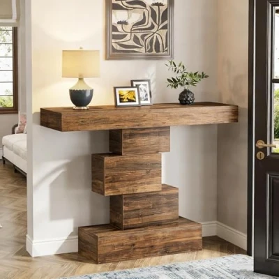 LITTLE TREE Rustic Wood Console Table, Reclaimed Timber, Geometric Stacked Design, 108cm x 80cm, Natural Brown Finish