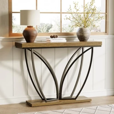 47 Inch Long Sofa Table: This unique sofa entryway table appeals with its sturdy and stylish industrial appeal. The industrial brown color of the top panel surface and the distinctive metal frame make it a unique and eye-catching furniture accent Reliable Construction: The tabletop of this entryway table is 1.97" thick and the metal frame strongly supports it. The tabletop measures 41.34" W x 11.61" D and provides over 100 pounds of support. Adjustable feet for stability on uneven surfaces Multiple Usage Scenarios: Perfect for any space, this control table's unique dimensions are ideal for use as a console, sofa table, coffee table, entry table, or even a TV stand.Whether in the living room, bedroom, dining room, or studio Sturdy and Easy To Clean: This sofa table is made of high quality MDF and its surface is easy to clean and sturdy.The metal frame provides strong support for long-lasting use Easy Assembly: Its unique design and clear instructions make it easy to install. No need to worry about the installation process, just follow the instructions.Each part is labeled and comes with an installation tool