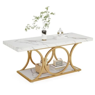 [Sophisticated Contemporary Coffee Table]: Elevate your living space with the exquisite coffee table, a combination of a white marble veneer top and sleek gold geometric metal legs. This white coffee table exudes modern luxury, creating a cozy and warm ambiance. [2-Tier Center Table]: Stay organized and always have your living room essentials within reach with the spacious tabletop and convenient bottom shelf of this minimalist coffee table. By promoting a clean and clutter-free environment, this modern coffee table helps you create a serene space perfect for relaxation. [Ideal Dimensions]: With measurements of 47.24" L * 19.68" W * 18.89" H, our rectangular coffee table strikes the perfect balance between size and functionality. Offering ample storage space without overwhelming the room, it is suitable for a variety of living spaces such as homes, studios, and apartments. [Robust & Enduring Structure]: Crafted with a 1.57-inch thickness E1 particle board and a sturdy metal base, this coffee table guarantees stability and durability for years to come. Its waterproof finish ensures scratch resistance and effortless cleaning, making it ideal for both work and dining in the living room. [Effortless Assembly]: Designed for ease of assembly, this simple coffee table can be put together by anyone. Clear assembly instructions are included, allowing you to effortlessly assemble this wood coffee table in less than 30 minutes. All necessary number-labeled hardware and assembly instructions are provided.