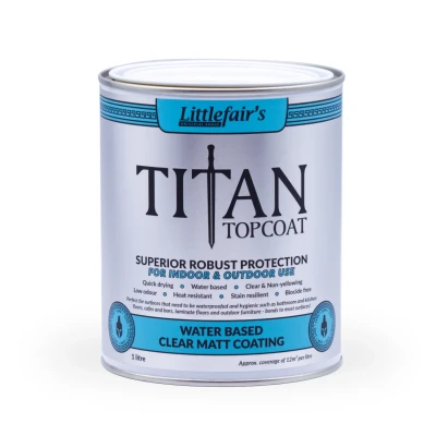 Littlefair'sIndoor & Outdoor Use - Clear Finish - Water Based Topcoat. Quick Drying - Non-yellowing - Low odour. Heat resistant - Stain resistant - Biocide free - UV Protection. Drying Time. Touch dry in approximately 30 minutes and can be recoated after 2-3 hours in suitable conditions.. Please note: this is an approximate drying time. There could be a number of factors that may affect this.. Coverage. Approx. coverage of 12m² per litre, for one liberal coat.. Our Titan Topcoat has been classified with: Scrubbable - Class 1 Wet Scrub Rating (ISO 11998). Titan Topcoat is a multipurpose, low odour and quick drying waterproof coating - providing a tough but flexible non-yellowing finish. It can be applied to most types of wood and sheet materials, such as plywood and MDF. In addition, it will bond to many other surfaces including masonry, concrete, terracotta, metal and laminates.. This waterproof varnish is perfect for surfaces that need to be waterproofed and hygienic such as bathroom and kitchen floors, cafes and bars, laminate floors and outdoor furniture.. This is not recommended for use with our oils.. If you'd like to read more about Titan Topcoat, please have a read of our blog here.