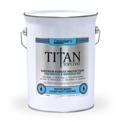Indoor & Outdoor Use - Clear Finish - Water Based Topcoat. Quick Drying - Non-yellowing - Low odour. Heat resistant - Stain resistant - Biocide free - UV Protection. Drying Time. Touch dry in approximately 30 minutes and can be recoated after 2-3 hours in suitable conditions.. Please note: this is an approximate drying time. There could be a number of factors that may affect this.. Coverage. Approx. coverage of 12m² per litre, for one liberal coat.. Our Titan Topcoat has been classified with: Scrubbable - Class 1 Wet Scrub Rating (ISO 11998). Titan Topcoat is a multipurpose, low odour and quick drying waterproof coating - providing a tough but flexible non-yellowing finish. It can be applied to most types of wood and sheet materials, such as plywood and MDF. In addition, it will bond to many other surfaces including masonry, concrete, terracotta, metal and laminates.. This waterproof varnish is perfect for surfaces that need to be waterproofed and hygienic such as bathroom and kitchen floors, cafes and bars, laminate floors and outdoor furniture.. This is not recommended for use with our oils.. If you'd like to read more about Titan Topcoat, please have a read of our blog here.