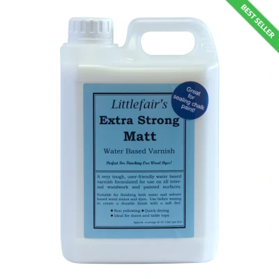 Indoor Use - Water Based - Quick Drying - Non-Yellowing. Great for Chalk Paint - User-Friendly - Extremely low VOC. Drying Time. The varnish will be touch dry in approximately 20 minutes and can usually be recoated after 2 hours in suitable conditions.. Please note: this is an approximate drying time. There could be a number of factors that may affect this.. Coverage. Approx. coverage of 10-12m² per litre, for one liberal coat.. Littlefair's Wood Finishing Products brings you a range of high quality water based extra strong user-friendly varnishes. We have three different finishes; Matt, Satin & Gloss.. Our Extra Strong Varnish is a very tough, user-friendly water based varnish that is non-yellowing and formulated for internal use on wooden and painted surfaces. It is ideal for finishing floors, doors and table tops and is also great for sealing chalk paint!. It is suitable for finishing both water and solvent based stains and dyes. Our Wax Polish can be used after the final coat to create a soft and durable finish. However, please do not use our Wax Polish on flooring.. If you are looking to use a varnish for your flooring, please use our Floor Fast Varnish or Titan Topcoat as this will provide greater protection for your floor.. Please note: Whilst waterproof, the varnish is not designed to have water sitting on it for long periods, our Titan Topcoat may be a more appropriate product.. If you'd like to read more about our varnishes, please have a read of our blog here.. Extra Strong Varnish is for indoor use only. If you're looking for a finishing product for outdoor use, please use either our Danish Oil, Decking Oil Plus or Titan Topcoat.