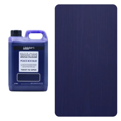 Indoor & Outdoor Use - Water Based - Environmentally Friendly - Non-Toxic. Quick Drying - Low Odour - Lightfast - Easy Brush Clean. Drying Time. Touch dry in approximately 2 hours.. Please note: this is an approximate drying time. There could be a number of factors that may affect this.. Coverage. Approx. coverage of 10-12m² per litre, for one liberal coat.. Littlefair's wood dyes are lovingly bottled by hand in the North West of England using the unique colour formulae created by Mr. Littlefair himself.. Our Special Colours can be used on all types of wood including sheet materials - such as plywood, MDF & veneered boards. It will also work great on rough sawn or rustic items both indoors and outdoors.. Black Black will create an instant, very dense black surface on your wood.. Police Box Blue both penetrates and coats new and old bare wood to create that Police Box colour.. Colour Reproduction. We endeavour to reproduce our colours and finishes as accurately as possible - both online and in print. However there are a range of factors to consider when comparing our samples to your chosen project: the type and condition of the surface itself may produce a slightly different appearance of the finished colour. Please bear in mind the shape, size and lighting conditions of your project.. Please note: Our Water Based Wood Dyes have a matt appearance when dry and come to life when finished with Littlefair’s Wood Finishing Products. We recommend finishing your project to provide the dyed wood with extra protection.. We do not recommend finishing Black Black with matt varnish as this can create a cloudy appearance.