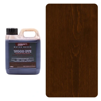 Outdoor Use - Water Based - Environmentally Friendly - Non-Toxic. Quick Drying - Low Odour - Lightfast - Easy Brush Clean. Drying Time. Touch dry in approximately 2 hours.. Please note: this is an approximate drying time. There could be a number of factors that may affect this.. Coverage. Approx. coverage of 10-12m² per litre, for one liberal coat.. Littlefair's wood dyes are lovingly bottled by hand in the North West of England using the unique colour formulae created by Mr. Littlefair himself.. We bring you a unique formula that penetrates the wood to produce a beautiful aged appearance on timber such as furniture, doors, skirting boards, architraves, mouldings and floors.. Our Antique Stripped Pine will create an authentic 'old stripped pine' effect, Dark Pine will create a warm and mellow colour, Golden Pine, Light Oak & Light Rosewood will create a warm, more modern shade, whilst Black Ebony, Brown Mahogany, Dark Red Mahogany, Very Red Mahogany, Dark Walnut, English Oak, French Oak, Golden Oak & Medium Oak will create an authentic hardwood colour.. Littlefair's wood dye produces the more natural 'positive' grain effect. Most other wood stains are more easily absorbed into the softer areas of the wood between the darker details of the natural grain. This results in the 'negative' stain effect as it causes the softer area to go darker which in turn leads the actual grain appearing lighter. Littlefair's wood stain enhances the darker details of the natural wood grain and produces the desired natural finish.. Colour Reproduction. We endeavour to reproduce our colours and finishes as accurately as possible - both online and in print. However there are a range of factors to consider when comparing our samples to your chosen project: the type and condition of the surface itself may produce a slightly different appearance of the finished colour. Please bear in mind the shape, size and lighting conditions.. Please note: Our Water Based Wood Dyes have a matt appearance when dry and come to life when finished with Littlefair’s Wood Finishing Products. We recommend finishing your project to provide the dyed wood with extra protection.. We do not recommend applying Black Ebony to decking, or in a place subject to standing water, as the dark ingredients can often prevent the dye from penetrating the wood thoroughly, having an adverse effect on the protective properties.. We do not recommend finishing Black Ebony with matt varnish as this can create a cloudy appearance.. Exterior Wood Dyes are intended for outdoor use but can also be used indoors.