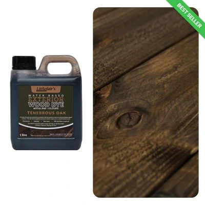 Water Based & Safe - Environmentally Friendly - Non-Toxic. Easy To Apply - Quick Drying - Lightfast - Easy Brush Clean. Drying Time. The dye will dry quickly in warm conditions and can be re-coated, if required after approximately 1-2 hours.. Please note: this is an approximate drying time. There could be a number of factors that may affect this.. Coverage. Littlefair's Woodland Colours should be applied quite liberally and should cover approximately 8-10m² per litre, for one liberal coat, but you will use more on rougher sawn wood. If you’re measuring your decking remember to allow for the greater surface area due to the grooves in the boards and the edge surfaces of the wood.. Littlefair’s Exterior Range Woodland Colours are made using a unique formula which allows the dye to both penetrate and bond with the wood to create an enduring, light fast depth of colour. The dye becomes part of the wood and will not flake or peel.. Littlefair's Woodland Colours are intended to mingle pleasantly into their surroundings, particularly your garden and outdoor areas. The dyes have been made a little stronger in colour to overcome the background green appearance often seen on pressure treated wood, such as decking, fence panels and garden buildings. A single liberal coat may well give sufficient coverage and depth of colour, but a further coat or coats will deepen the shade.. Safe Water Based Wood Dye. Our Water Based Exterior Wood Dyes are safe to use for you, your pets and the environment. They can also be used indoors if a particular colour is suitable for your project and they can be further finished with any of our wax polishes, oils or varnishes.. Colour Reproduction. The images in this listing include one liberal coat of dye (applied along the grain to rough sawn pine), finished in two coats of Superior Decking Oil Plus⁺.. We endeavour to reproduce our colours and finishes as accurately as possible - both online and in print. However there are a range of factors to consider when comparing our samples to your chosen project: the type and condition of the surface itself may produce a slightly different appearance of the finished colour. Please bear in mind the shape, size and lighting conditions.. Please note: Our Water Based Wood Dyes have a matt appearance when dry and come to life when finished with Littlefair’s Wood Finishing Products. We recommend finishing your project to provide the dyed wood with extra protection.. Exterior Wood Dyes are intended for outdoor use but can also be used indoors.