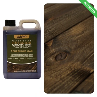 Water Based & Safe - Environmentally Friendly - Non-Toxic. Easy To Apply - Quick Drying - Lightfast - Easy Brush Clean. Drying Time. The dye will dry quickly in warm conditions and can be re-coated, if required after approximately 1-2 hours.. Please note: this is an approximate drying time. There could be a number of factors that may affect this.. Coverage. Littlefair's Woodland Colours should be applied quite liberally and should cover approximately 8-10m² per litre, for one liberal coat, but you will use more on rougher sawn wood. If you’re measuring your decking remember to allow for the greater surface area due to the grooves in the boards and the edge surfaces of the wood.. Littlefair’s Exterior Range Woodland Colours are made using a unique formula which allows the dye to both penetrate and bond with the wood to create an enduring, light fast depth of colour. The dye becomes part of the wood and will not flake or peel.. Littlefair's Woodland Colours are intended to mingle pleasantly into their surroundings, particularly your garden and outdoor areas. The dyes have been made a little stronger in colour to overcome the background green appearance often seen on pressure treated wood, such as decking, fence panels and garden buildings. A single liberal coat may well give sufficient coverage and depth of colour, but a further coat or coats will deepen the shade.. Safe Water Based Wood Dye. Our Water Based Exterior Wood Dyes are safe to use for you, your pets and the environment. They can also be used indoors if a particular colour is suitable for your project and they can be further finished with any of our wax polishes, oils or varnishes.. Colour Reproduction. The images in this listing include one liberal coat of dye (applied along the grain to rough sawn pine), finished in two coats of Superior Decking Oil Plus⁺.. We endeavour to reproduce our colours and finishes as accurately as possible - both online and in print. However there are a range of factors to consider when comparing our samples to your chosen project: the type and condition of the surface itself may produce a slightly different appearance of the finished colour. Please bear in mind the shape, size and lighting conditions.. Please note: Our Water Based Wood Dyes have a matt appearance when dry and come to life when finished with Littlefair’s Wood Finishing Products. We recommend finishing your project to provide the dyed wood with extra protection.. Exterior Wood Dyes are intended for outdoor use but can also be used indoors.