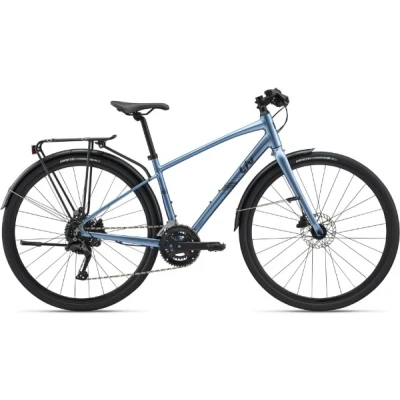 The Liv Alight Disc 2 City is built for the modern rider who wants comfort and convenience without compromise. Its lightweight ALUXX-grade aluminium frame provides an easy step-through design, ideal for quick stops and starts in town. The geometry promotes a comfortable upright position, giving riders clear visibility and reducing strain on the neck and shoulders during longer rides.Key Features:ALUXX-grade aluminium step-through frame for easy mounting and comfortAlloy fork with disc mounts for stable, confident handlingShimano CUES 2x9 drivetrain for smooth, reliable shiftingTektro HD-R280 hydraulic disc brakes, 160mm rotorsGiant GX Disc wheels with S-X2 700x38c puncture-protected tyresIncludes mudguards, rear rack, and kickstandAvailable with 0% APR financeThe alloy fork keeps the steering responsive and stable, while the Giant D-Fuse seatpost adds subtle flex to absorb road vibrations. Combined with ergonomic shock-absorbing grips and Liv’s pressure-relieving ErgoMax saddle, the Alight Disc 2 City is designed to make every commute or leisure ride as smooth and comfortable as possible.Shimano’s CUES 2x9-speed drivetrain provides precise, reliable shifting with a wide gear range for tackling hills or picking up speed on the flat. The 30/46T chainset and 11–36T cassette give you plenty of gearing options whether you’re navigating city streets or exploring country lanes.Braking is handled by powerful Tektro HD-R280 hydraulic disc brakes, which deliver consistent stopping performance in all weather conditions. Combined with 700x38c Giant S-X2 tyres featuring puncture protection, you can ride with confidence across a variety of surfaces from smooth tarmac to rougher urban paths.This “City” edition of the Alight Disc 2 comes fully equipped with practical features, including fitted mudguards, a sturdy rear rack for carrying bags or panniers, and an integrated kickstand for convenience when parking. The frame also has additional clearance for tyres up to 40c, giving you the flexibility to add wider rubber for even greater comfort and grip.