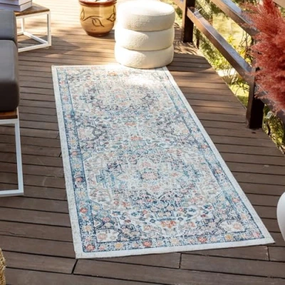 Indoor outdoor runner rug collection featuring floral abstract rug designs in multi coloured combinations of blue, navy, rust, tan, grey, beige and cream colours for your hallway Durable runner rugs machine woven in Turkey with 100% polyester fibres; these flat 0.51mm pile colourful rugs are designed for high traffic indoor/outdoor areas Designed to withstand everyday wear; this rug is child approved and pet friendly for heavily frequented spaces; Oeko-Tex standard 100 certified Easy care cleaning; created with the outdoor elements in mind. UV Weather and Stain Resistant and simply shake, spot clean, vacuum or hose off as needed to clean Easy care cleaning; created with the outdoor elements in mind. UV Weather and Stain Resistant and simply shake, spot clean, vacuum or hose off as needed to clean