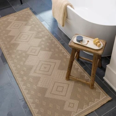 Machine washable living room home rug collection featuring modern, colourful patterned rug designs in a contemporary geometric style, multicoloured rug combinations of Tan, Beige, Cream, Light Beige colours Strong and durable vintage area rugs, in a range of small, medium, large, round rugs and runner rug sizes, machine woven in 50% Cotton, 50% Jute, a washable rug designed for maximum durability, with no pile; durable, moisture, bleach and stain resistant Designed to withstand everyday wear; this colourful and hard wearing rug is child approved and pet friendly. Oeko-Tex standard 100 certified; free of any harmful substances and hypoallergenic Easy care pile cleaning; for long lasting lounge rugs vacuum regularly and machine wash at 30 degrees for a clean carpet. Use of a rug pad is recommended to prevent slippage and movement Perfect area rugs for living room and other high traffic rooms in your house; lounge, dining room, bathroom, kitchen runner, hall corridor, office, bedroom, playroom, hallways and outdoor decor for balcony and terrace