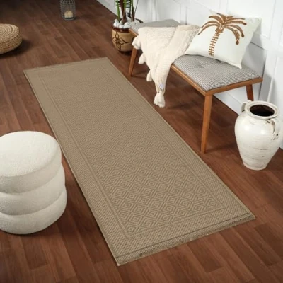 Machine washable, hallway runner rug collection eaturing classic, traditional patterned vintage rug designs in a shabby chic oriental moroccan style, multicoloured combinations of Tan, Beige colours Strong and durable vintage area rugs, in a range of small, medium, large, round rugs and runner rug sizes, machine woven in 100 % Jute, a washable rug designed for maximum durability, with no pile; durable, moisture, bleach and stain resistant Designed to withstand everyday wear; this colourful and hard wearing rug is child approved and pet friendly. Oeko-Tex standard 100 certified; free of any harmful substances and hypoallergenic Easy care pile cleaning; for long lasting lounge rugs vacuum regularly and blot up small floor rug stains with a mild detergent or carpet cleaner. Use of a rug pad is recommended to prevent slippage and movement Perfect area rugs for living room and other high traffic rooms in your house; lounge, dining room, bathroom, kitchen runner, hall corridor, office, bedroom, playroom, hallways and outdoor decor for balcony and terrace