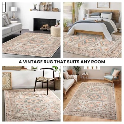 Living room rug collection featuring classic, traditional patterned and bohemian rug designs in a shabby chic oriental style, multicoloured rug combinations of Dusty Pink, Sky Blue, Off-White, Light Gray, Charcoal, Mustard, Rust colours Strong and durable soft area rugs in a range of small, medium, large, round rugs and runner rug sizes, machine woven in 100% polypropylene, with a virtually non-shedding, 8mm thick pile; durable, moisture, bleach and stain resistant Designed to withstand everyday wear; this colourful and hard wearing rug is child approved and pet friendly Oeko-Tex standard 100 certified; free of any harmful substances and hypoallergenic Easy care pile cleaning; for long lasting coloured lounge rugs vacuum regularly and blot up small floor rug stains with a mild detergent or carpet cleaner Perfect area rugs for living room and other high traffic rooms in your home; lounge, dining room, kitchen runner, corridor, office, bedroom, playroom and hallways