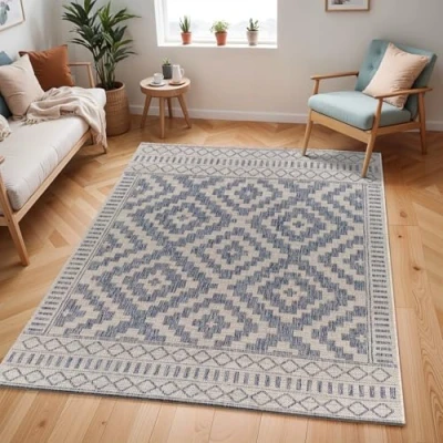 Livabliss Geometric Indoor Large, Salema 200x275 cm Patio s, Decking, Carpet Boho Colourful Garden Patterned, UV Weather, Stain Durable, Cream, Blue