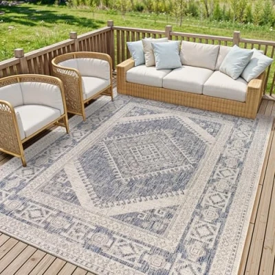 Indoor outdoor rug collection featuring vintage rug designs in multi coloured combinations of Pale Blue, Tan, Navy, Blue, Taupe, Off White, Grey colours Durable rugs machine woven in Turkey with 100% polypropylene fibres; these flat no pile colourful rugs are designed for high traffic indoor/outdoor areas Designed to withstand everyday wear; this rug is child approved and pet friendly for heavily frequented spaces; Oeko-Tex standard 100 certified Easy care cleaning; created with the outdoor elements in mind. UV Weather and Stain Resistant and simply shake, spot clean, vacuum or hose off as needed to clean Perfect for high traffic areas of your home; living room, dining room, kitchen and hallways, as an awning carpet and any outside setting: poolside, covered patios or balcony decking