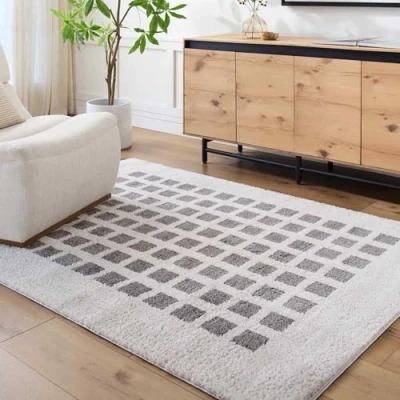 Living room rug collection featuring modern, natural styles, luxurious fluffy rugs with abstract geometric pattern designs in combinations of Light Beige, Charcoal colours Soft fluffy rugs, in a range of small, medium, large, round rugs and runner rug sizes, machine woven in 100% polyester, with a virtually non-shedding, 50 mm thick plush pile; soft and luxurious shaggy lounge and bedroom rug Designed to withstand everyday wear; this plush thick rug is child approved and pet friendly, Oeko-Tex standard 100 certified; free of any harmful substances and hypoallergenic Easy care pile cleaning; for a long lasting berber rug, vacuum regularly and blot up small floor rug stains with a mild detergent or carpet cleaner Luxurious and soft shaggy rugs for living room, or as an ideal bedroom rug; at the side of your bed to submerge your feet into, for warmth and natural soft touch comfort