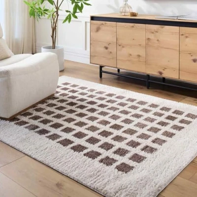 Living room rug collection featuring modern, natural styles, luxurious fluffy rugs with abstract geometric pattern designs in combinations of Light Beige, Dark Brown colours Soft fluffy rugs, in a range of small, medium, large, round rugs and runner rug sizes, machine woven in 100% polyester, with a virtually non-shedding, 50 mm thick plush pile; soft and luxurious shaggy lounge and bedroom rug Designed to withstand everyday wear; this plush thick rug is child approved and pet friendly, Oeko-Tex standard 100 certified; free of any harmful substances and hypoallergenic Easy care pile cleaning; for a long lasting berber rug, vacuum regularly and blot up small floor rug stains with a mild detergent or carpet cleaner Luxurious and soft shaggy rugs for living room, or as an ideal bedroom rug; at the side of your bed to submerge your feet into, for warmth and natural soft touch comfort
