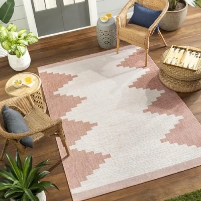 Indoor outdoor rug collection featuring geometric abstract striped, chequered and diamond patterned rug designs in multi combinations of Rust, Ivory, Dusty Pink, Dusty Coral rug colours Durable rugs machine woven in Turkey with 100% polypropylene fibres; these flat pile colourful rugs are designed for high traffic indoor/outdoor areas Designed to withstand everyday wear; this colourful and hard wearing rug is child approved and pet friendly. Oeko-Tex standard 100 certified; free of any harmful substances and hypoallergenic Easy care pile cleaning; for long lasting lounge rugs vacuum regularly and blot up small floor rug stains with a mild detergent or carpet cleaner. Use of a rug pad is recommended to prevent slippage and movement Perfect for high traffic areas of your home; living room, dining room, kitchen and hallways, as an awning carpet and any outside setting: poolside, covered patios or balcony decking