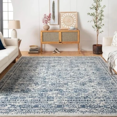 Living room rug collection featuring classic, traditional patterned and oriental rug designs in a shabby chic natural style with combinations of dark blue, light blue, white rug colours Strong and durable soft area rugs in a range of small, medium, large, round rugs and runner rug sizes, machine woven in 100% polypropylene, with a virtually non-shedding 8mm thick pile; durable, moisture, bleach and stain resistant Designed to withstand everyday wear; this hard wearing neutral rug is child approved and pet friendly. Oeko-Tex standard 100 certified; free of any harmful substances and hypoallergenic Easy care pile cleaning; for long lasting natural lounge rugs, vacuum regularly and blot up small floor rug stains with a mild detergent or carpet cleaner Perfect vintage area rugs for living room and other high traffic rooms in your home; lounge, dining room, kitchen runner, corridor, office, bedroom, playroom and hallways