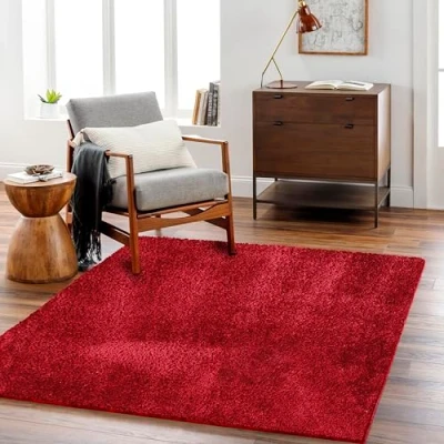 Living room rug collection featuring modern, natural styles, luxurious fluffy rugs with abstract geometric pattern designs in combinations of haute red colours Soft fluffy area rugs, in a range of small, medium, large, round rugs and runner rug sizes, machine woven in polyester, with a virtually non-shedding, 28mm thick plush pile; soft and luxurious shaggy rugs Designed to withstand everyday wear; this rug is child approved and pet friendly, Oeko-Tex standard 100 certified; free of any harmful substances and hypoallergenic Easy care pile cleaning; for long lasting lounge rugs vacuum regularly and blot up small floor rug stains with a mild detergent or carpet cleaner Luxurious and soft shaggy rugs, ideal area rugs for living room or as bedroom rugs; at the side of your bed to submerge your feet into, for warmth and natural soft touch comfort
