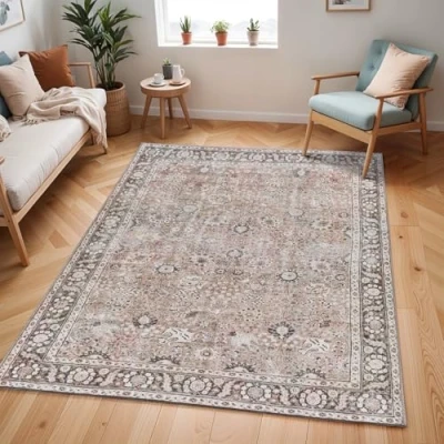 Livabliss Terjit Machine Washable Rug Vintage Area Rugs Living Room, Large 120x170 cm Traditional Boho Style, Dining Kitchen, Outdoor, Hallway Brown, Charcoal, Black