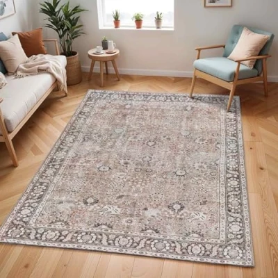 Livabliss Terjit Machine Washable Rug Vintage Area Rugs Living Room, Large 160x220 cm Traditional Boho Style, Dining Kitchen, Outdoor, Hallway Brown, Charcoal, Black
