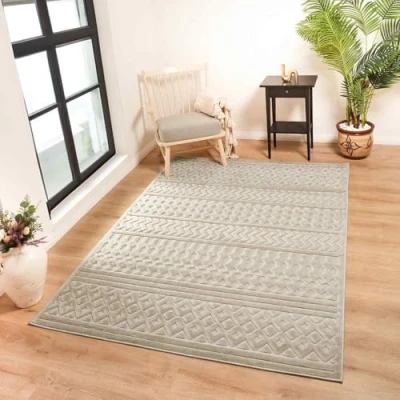 Living room and kitchen rug collection featuring modern style, vintage, abstract and geometric patterned rug designs in neutral and coloured combinations of Sesame rug colours Strong and durable area rugs for kitchen, living and dining rooms in a range of small, medium, large, round and runner rug sizes, machine woven in polypropylene with a non-shedding flat pile; durable, hard wearing, patterned neutral & coloured rugs Designed to withstand everyday wear; this waterproof modern boho rug is child approved and pet friendly for heavily frequented indoor and outdoor spaces. Oeko-Tex standard 100 certified; free of any harmful substances and hypoallergenic Easy care cleaning; for long lasting large living room rugs vacuum regularly and blot up small floor rug stains with a mild detergent or carpet cleaner. For indoor outdoor rug use, simply shake, spot clean, vacuum or hose off as needed to clean The perfect large kitchen rug in vintage and geometric rug designs for high traffic areas in your home; living room, dining room, bedroom, hallway runner, office, playroom and any outside setting: outdoor patio, garden, poolside or balcony decking