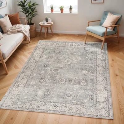 Living room rug collection featuring classic, traditional patterned and oriental rug designs in a shabby chic natural style with combinations of Medium Grey, Taupe, Light Grey, Charcoal, White colours Strong and durable soft area rugs in a range of small, medium, large, extra large, round rugs and runner rug sizes, machine woven in polyester, with a virtually non-shedding 6.1 thick pile; durable, moisture, bleach and stain resistant Designed to withstand everyday wear; this hard wearing neutral rug is child approved and pet friendly; oeko-Tex standard 100 certified; free of any harmful substances and hypoallergenic Easy care pile cleaning; for long lasting natural lounge rugs, vacuum regularly and blot up small floor rug stains with a mild detergent or carpet cleaner Perfect vintage area rugs for living room and other high traffic rooms in your home; lounge, dining room, kitchen runner, corridor, office, bedroom, playroom and hallways