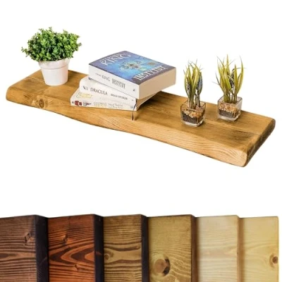 SUSTAINABLE & HANDCRAFTED QUALITY: Our rustic floating shelves are made from solid pine, sustainably sourced from European sawmills. With its live edge detail and hand-finished texture, our floating shelf wood is also a solid wood shelf solution for your home. Ideal as a reclaimed wood shelf or long wooden shelf for any room. This waney/live edge wooden floating shelf adds rustic appeal to your home decor which is Suitable for solid walls and will NOT work with unsecured plasterboard walls. PREMIUM WAX FINISH: To protect and enhance the beauty of the wooden floating shelves, we apply a premium wax finish that brings out the natural grain, adding depth and warmth. This finish not only intensifies the rustic shelves charm but also provides a layer of protection from wear and tear, ensuring your floating shelves wood maintain their beauty for years. The wax finish also gives a subtle, smooth texture that feels luxurious to the touch. HEAVY-DUTY DRIFTWOOD SHELVES DESIGN SUPPORTS UP TO 20KG: Engineered for durability, our waney/live edge wood floating shelf supports up to 20kg and fits well in any setting as a floating radiator shelf, floating mantel shelf, or narrow floating shelf. Strong enough for use as thick wooden shelves or large floating shelves, it’s a solid wood shelf that works as both a shelf with brackets and a wood shelf for wall display. EASY INSTALLATION WITH INCLUDED FIXINGS: Our floating wooden shelf comes with pre-drilled holes and fixings for quick setup. Ideal as a wooden radiator shelf or floating wooden shelf, this wood shelf works on solid walls ONLY. From rustic floating shelves to shelf wood for kitchens or offices, it’s an excellent choice for radiator shelf, rustic wood shelves or floating style shelves for wall setups. CUSTOM SIZES AVAILABLE TO FIT YOUR SPACE: If you need a bespoke size for your home, we offer custom orders to fit your exact dimensions. Simply send us your custom shelf size request, and we’ll provide a quick quote. Please note that natural wood properties may cause slight size variations, adding to the unique appeal of each floating wooden shelves. Our goal is to ensure you get the perfect fit for your space, no matter how specific your needs are.