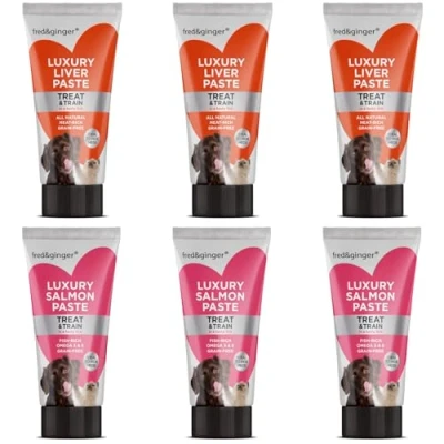 Included – This listing contains a mix of six Fred & Ginger luxury liver and salmon paste tubes, each weighing 75g, providing a mess-free and easy-to-use treat for pets. Ideal – Designed as a perfect training aid, this squeezable paste allows for precise portion control, making it a great reward for reinforcing good behavior on walks. Convenient – The compact 75g tube easily fits into pockets or bags, ensuring you always have a quick, mess-free treat on hand during outdoor adventures with your pet. Free From – Made without grains, artificial colours, flavours, or preservatives, this hypoallergenic paste is a gentle, natural option suitable for both dogs and cats. Easy to Use – The soft, squeezable tube makes it effortless to dispense the right amount of paste without waste, providing a hassle-free way to treat or medicate pets.