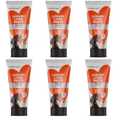 Included: Pack of 6 Fred & Ginger luxury Liver Paste tubes, each 75g, offering a long-lasting supply of rich, high-meat dog liver paste perfect for daily treating, training rewards, enrichment activities and walks. The 6-pack ensures you always have a tube ready at home, in the car or in your walking bag. Ideal: This smooth liver paste for dogs is perfect for training, recall, rewarding good behaviour and keeping dogs motivated during walks or practice sessions. It spreads easily in lick mats, puzzle toys and feeders, and the soft texture makes disguising medication simple, helping even fussy dogs take tablets without stress. Convenient: Each 75g tube is lightweight, pocket-friendly and designed for clean, mess-free use, giving you instant rewards wherever you are. The easy-squeeze format makes this dog liver paste perfect for travelling, outdoor adventures or quick training sessions, with a screw-cap that reseals securely for repeated use. Free From: Made with a grain-free recipe and completely free from artificial colours, flavours and preservatives, this liver paste offers a gentle option for puppies, adult dogs and seniors. Ideal for sensitive stomachs, providing a natural, high-meat dog pate that delivers flavour without unnecessary ingredients. Versatile: Use this liver paste as a high-value training reward, enrichment filler, snack or medication aid. The soft, spreadable texture works perfectly in lick mats, treat toys and puzzle feeders, helping reduce boredom, anxiety and stress while keeping dogs focused, engaged and excited during daily routines.