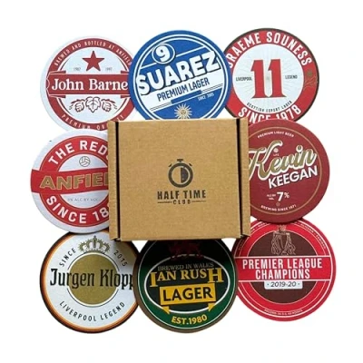 BUNDLE OF 8 - A must-have for any Liverpool fan! Get 8 Liverpool inspired beer mats - perfect for displaying your support for the team at any party or gathering. Show your allegiance with The Reds with these LFC themed beer mats. PERFECT PRESENT - Surprise your favourite Liverpool fan with these Beer Mat Coasters! A unique and thoughtful gift they'll love. Making a great stocking filler. GIFT PACKAGED - Arriving in a premium gift box ensuring your beer mats come in perfect condition, hassle-free. PREMIUM PULPBOARD - This beer mat set is made of a durable, high-quality, thick, absorbent pulpboard that'll make any footy fan proud. Perfect for keeping your drinks and tables safe. UNIQUE DESIGNS - Indulge in a relaxed and nostalgic vibe as you enjoy your favourite drink, surrounded by the iconic players, club songs, and historic moments that define the team's legacy.
