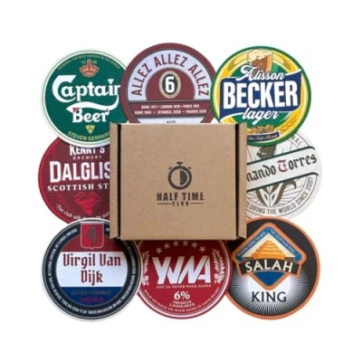 BUNDLE OF 8 - A must-have for any Liverpool fan! Get 8 Liverpool inspired beer mats - perfect for displaying your support for the team at any party or gathering. Show your allegiance with The Reds with these LFC themed beer mats. PERFECT PRESENT - Surprise your favourite Liverpool fan with these Beer Mat Coasters! A unique and thoughtful gift they'll love. Making a great stocking filler. GIFT PACKAGED - Arriving in a premium gift box ensuring your beer mats come in perfect condition, hassle-free. PREMIUM PULPBOARD - This beer mat set is made of a durable, high-quality, thick, absorbent pulpboard that'll make any footy fan proud. Perfect for keeping your drinks and tables safe. UNIQUE DESIGNS - Indulge in a relaxed and nostalgic vibe as you enjoy your favourite drink, surrounded by the iconic players, club songs, and historic moments that define the team's legacy.