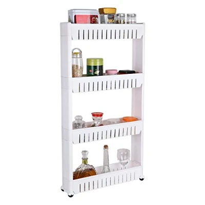 SLIM STORAGE – At 12cm wide, this slim storage cart can squeeze into the tight spaces like next to the fridge, in the bathroom or in between the washer and dryer. Keeping your home neat and organized has never been easier. 4 TIER ROLLING CART – The four 55cm long shelves provide storage space for canned food, spices, laundry soaps, pet supplies, household cleaner and even kid’s toys. This thin, slide out shelving unit can help make like a little less cluttered. ROLLING DESIGN – This mobile rack is designed with 4 PVC wheels so you can effortlessly pull it in and out of narrow spaces. Slide it between kitchen cabinets, next to your sewing desk, or between the sink and the toilet for bathroom storage. VERSATILE STORAGE – The easy to clean white finish of this rolling organizer is suited for most home or office décor. The thin design of this space saving organizer is ideal for apartments, condos, dorms, and campers. PRODUCT DETAILS – Material: Plastic and PVC. Dimensions: (W) 55cm x (D) 12cm x (H) 110cm. Shelves are 8.5cm deep. Color: White.